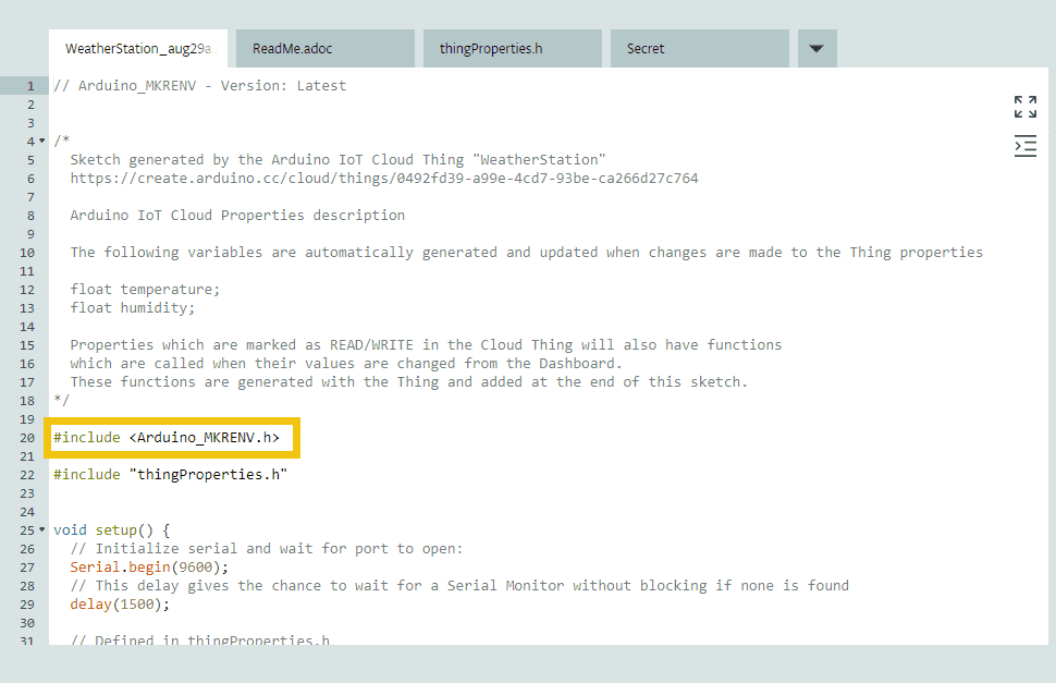 Once you have added the properties, you should click the “Edit Sketch” button that will open the code editor with the self-generated sketch. This includes the libraries needed for the Cloud communication to work. You will have to add the libraries for the ENV Shield, the SSID and password to connect to your WiFi network, and whatever code you are going to use to update variables in your program.