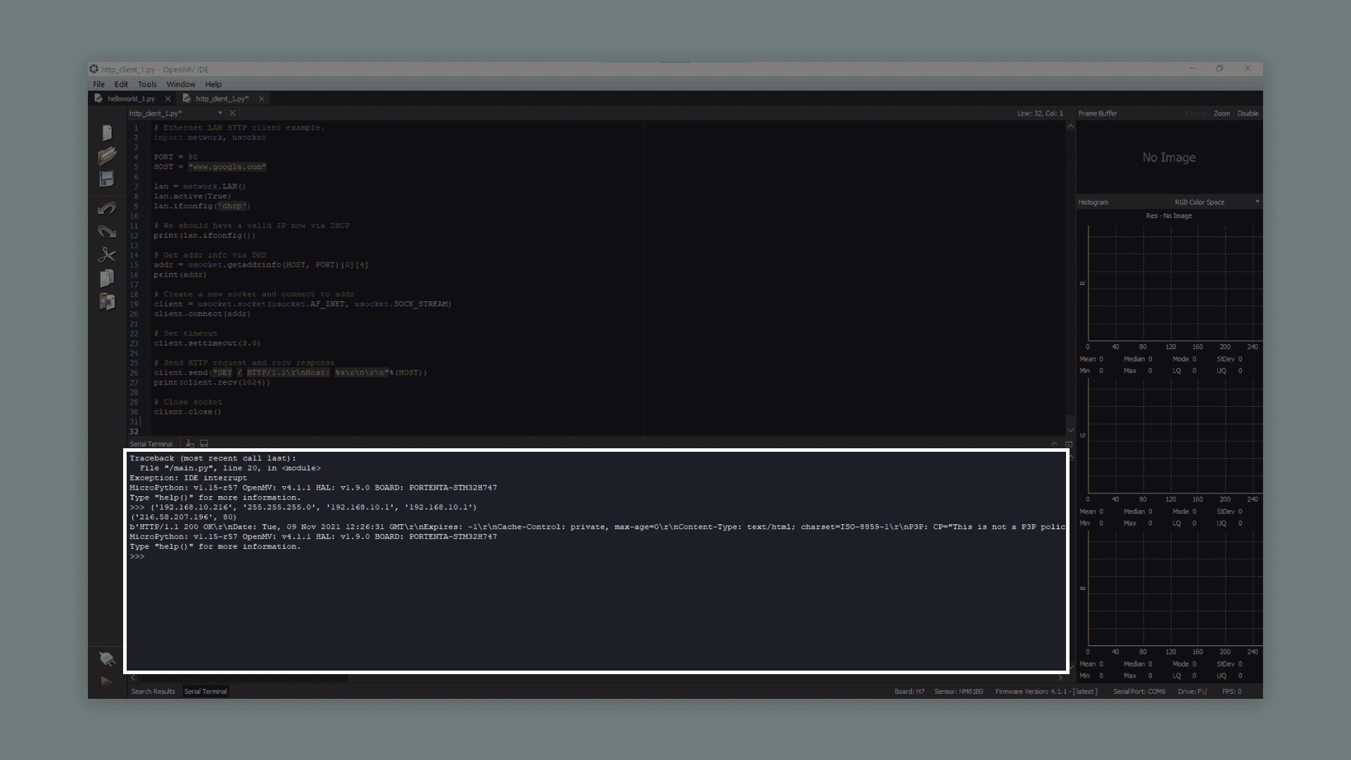 4client = usocket.socket(usocket.AF_INET, usocket.SOCK_STREAM)5client.connect(addr)This will print the websites content in the serial terminal in OpenMV. The argument inside the